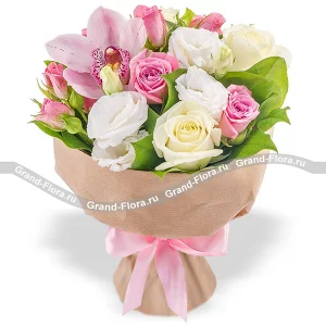 Сны о тебе – букет из розовой и белой розы с эустомой