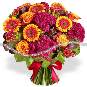 Букет оранжевых роз + хризантемы - Осенний коктейль