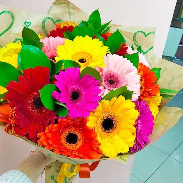 поможет солнечное сочетание пестрых гербер. Нежно розовый цвет намекнет о симпатии, желтый о дружеском интересе, оранжево-красный станет комплиментом, а насыщенно-розовый