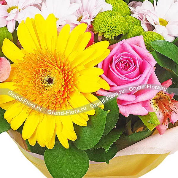 Стандартный (на фото): роза розовая - 7 шт, гербера желтая - 2 шт, альстромерия розовая - 4 шт, хризантема кустовая зеленая - 3 шт, хризантема кустовая светлая - 2 шт, рускус, фетр желтый. Примерный размер: 25Х25 см.