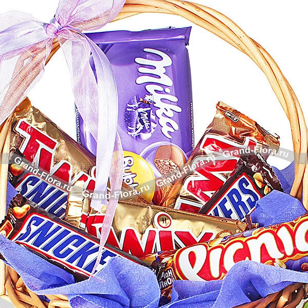 ЛЮКС: роза красная (70 см) - 1 шт., Twix - 4 шт., Snikers (маленький) - 4 шт., Picnic - 2 шт., шоколад "Milka" - 2 шт., декоративная зелень, корзина малая, фетр фиолетовый, бант сиреневый.