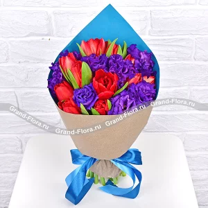 Стандартный: орхидея белая - 1 шт., ирис синий - 7 шт., эустома розовая - 6 шт., тюльпан фиолетовый - 5 шт., эвкалипт, оазис, коробка.