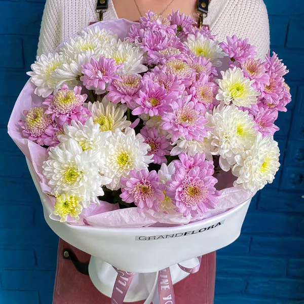 21 хризантем: хризантема кустовая белая - 11 шт., хризантема кустовая розовая  - 10 шт.,  упаковка, лента (возможна замена вида хризанетмы и оттенка розовой хризантемы от светло-розвого до темно-вишневого).